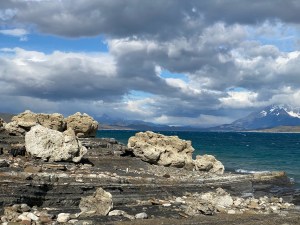 Sarmiennto Lake is a closed lake thus it has a very high PH resulting in no plant life or fish. Given the wind was whipping the water into a froth, acidity level would be secondary to plant survival.