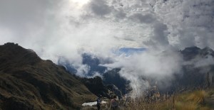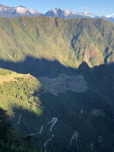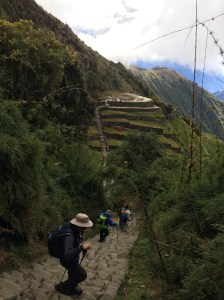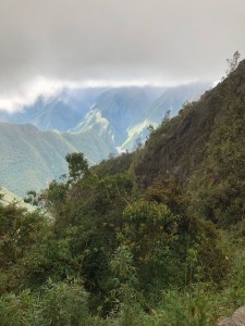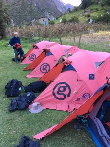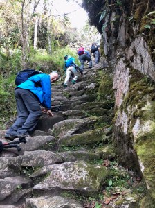 The length of the day’s trek, the severity of both the first uphill segment, the storm and the constant downhill meant the last twenty minutes of the trek was done in the dark wearing our miners headlamps. It was indeed an 11 hour day of hiking. All the trekking groups and porters are congregated at a large, multi tiered campsite as tomorrow we make the “dash” to Machu Picchu. An early turn in as tomorrow starts at 3:15 a.m. Ugggh.