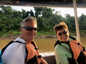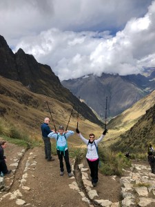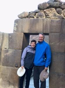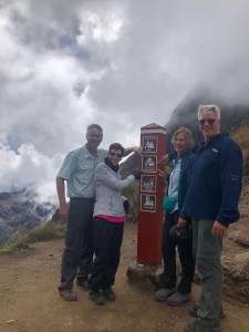 Of course our trek was not officially over as we had to walk down, 45 minutes, to actually reach the site. Not sure what the medical condition is but we were all well past the rubbery leg syndrome and approaching muscle seizures. With Huayna Picchu as a backdrop we stopped with Louise & Doug Pegg at the iconic spot where likely more photos have been taken of Machu Picchu than any other.