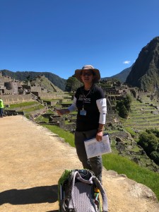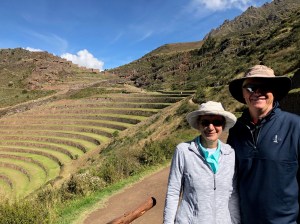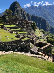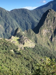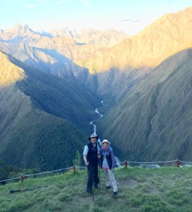 Of course our trek was not officially over as we had to walk down, 45 minutes, to actually reach the site. Not sure what the medical condition is but we were all well past the rubbery leg syndrome and approaching muscle seizures. With Huayna Picchu as a backdrop we stopped with Louise & Doug Pegg at the iconic spot where likely more photos have been taken of Machu Picchu than any other.