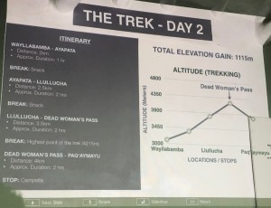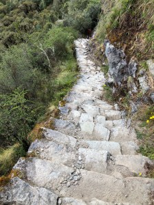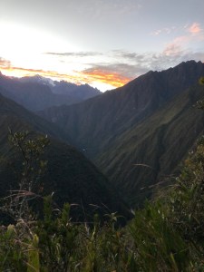 The length of the day’s trek, the severity of both the first uphill segment, the storm and the constant downhill meant the last twenty minutes of the trek was done in the dark wearing our miners headlamps. It was indeed an 11 hour day of hiking. All the trekking groups and porters are congregated at a large, multi tiered campsite as tomorrow we make the “dash” to Machu Picchu. An early turn in as tomorrow starts at 3:15 a.m. Ugggh.