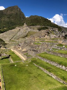 That last obstacle behind us it was on to the sun gate and our first glimpse of Machu Picchu. Fortunately the weather cooperated perfectly. While all the surrounding peaks were alight with sunshine the city was in shadows when we arrived high up on the south side of the mountain.