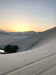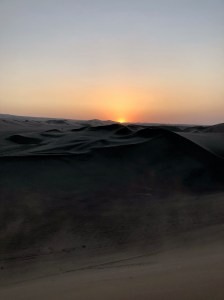 On to Ica and a lovely modern resort before exploring the Huacachina oasis and sand dunes 10 Kms away. The dunes are staggeringly large and stretch for miles. Climbing part way up one ridge line was challenging enough. We’re planning to return tomorrow to go sand boarding and taking a dune buggy ride. Fortunately we caught the sunset to end our day.