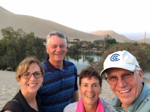 Our first day in Peru was a tale of opposites. Lima, a chaotic mass of 9M inhabitants, offers the craziness of free for all traffic on roads full of massive potholes. Unfinished buildings abound (apparently that’s a tax advantage) and the sanitation department is obviously underfunded. Once we got on to the highway heading south, the world changed. Total desolation with miles of sandstone brown desert stretching to the horizon. For three days prior to joining the tour group we’re travelling with Doug & Louise Pegg, who have been great friends for decades.